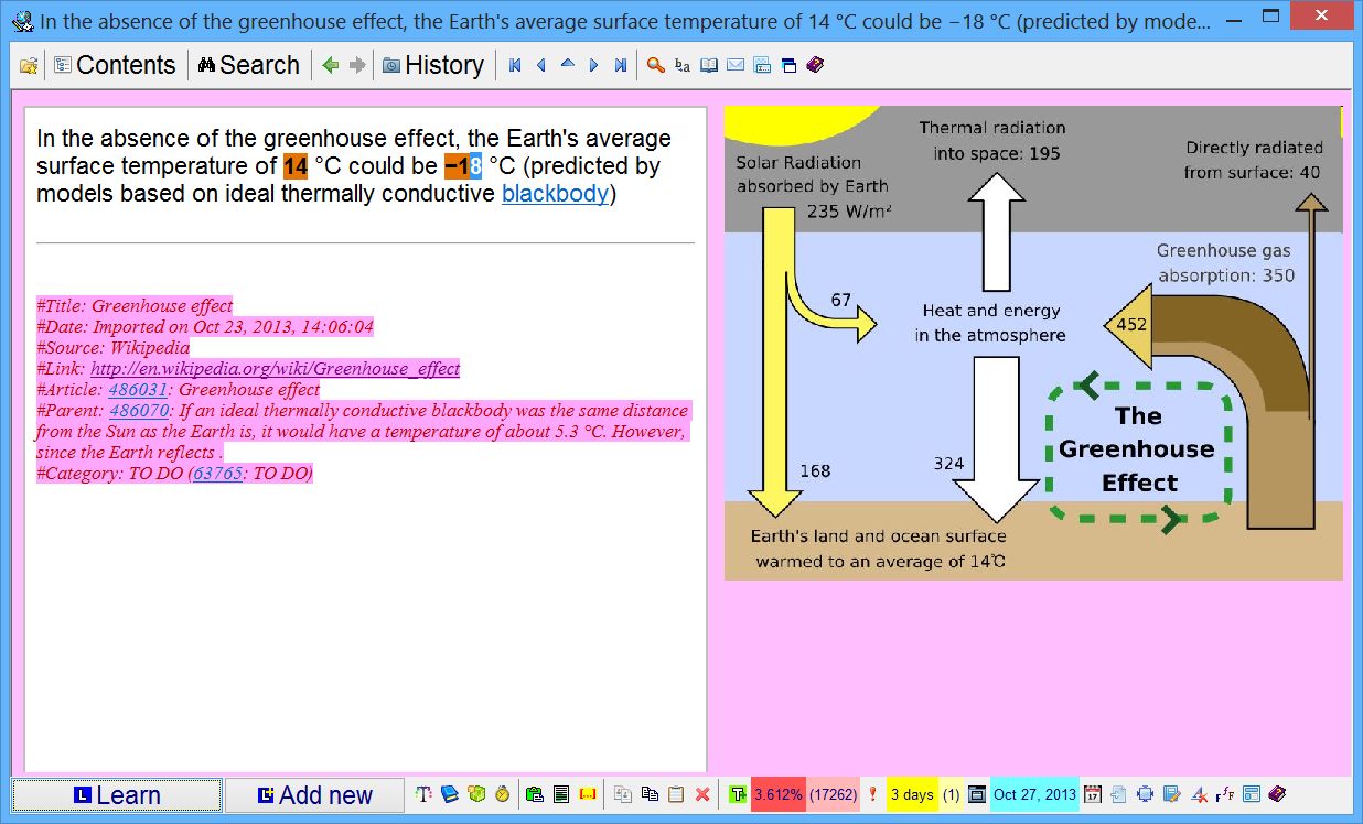 Figure: Typical snapshot of incremental reading. While learning about the greenhouse effect, the student extracts the fragment saying that "In the absence of the greenhouse effect and an atmosphere, the Earth's average surface temperature of 14 °C could be as low as -18 °C, the black body temperature of the Earth.". The extracted fragment will inherit illustrations placed on the right, as well as article references. The student can move on to reading another article by pressing Enter. The picture on the right is stored locally in the image registry (on the user's hard disk) and can be reused to illustrate other articles or questions.