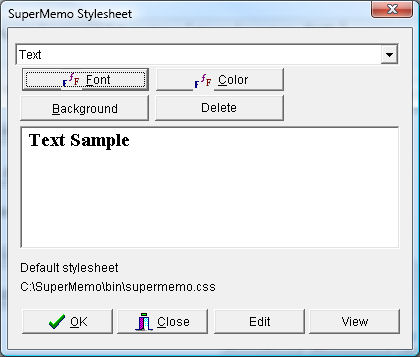 - Edit - if you know CSS, you could use this button to open the default SuperMemo stylesheet in the default editor (e.g. Notepad), and manually edit individual CSS rules beyond the basic properties provided in the editor (e.g. you could increase the spacing between lines of text of a given CSS rule by adding the line-height CSS property)