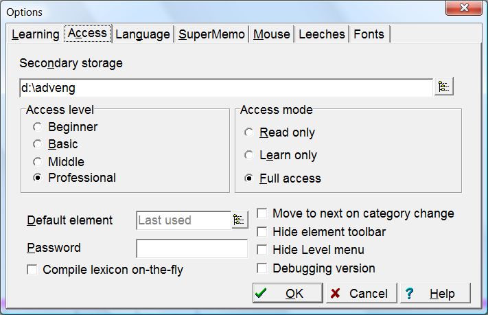 - Access level - determines the difficulty level of SuperMemo (same as in File : Level):