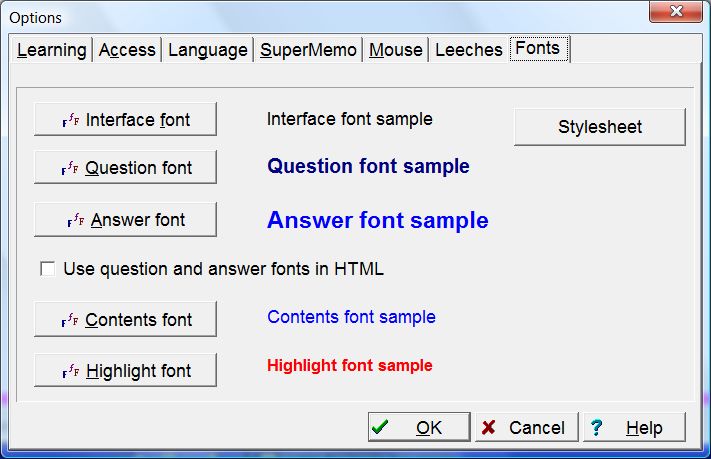 - Question font defines the default font for texts components. This font will be used in all texts components where you do not specify a font yourself. Only answers components will use the font defined with Answer font below. Changing Question font will change the initial font used in editing HTML or RTF components (if the following option below is checked: Use question and answer fonts in HTML). It will also affect all plain text components whose font is not specified. It will not change the appearance of HTML and RTF components created in the past. Whenever SuperMemo is not sure which font to use, it will use Question font in various circumstances