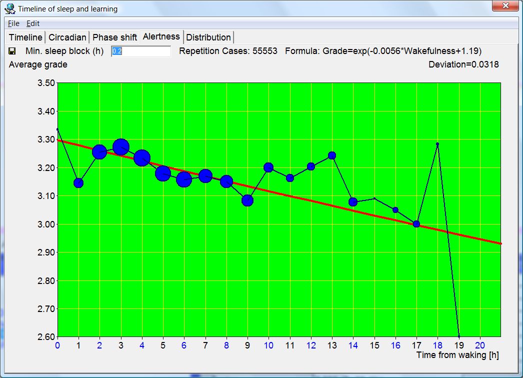 Forgetting is random in nature. There are many factors that can make you forget or remember. SuperMemo cannot predict all those factors, however, there is one variable whose impact on learning is easy to compute: alertness. There is an easy-to-measure drop in alertness in waking time (assuming healthy sleep patterns and a free-running or nearly-free-running sleep). SuperMemo has never considered this variable in the past. With each interfering factor eliminated, SuperMemo algorithms can be more accurate in predicting the drop in your ability to recall a piece of information. Each variable taken into account makes it possible to increase the average length of optimum intervals that produce a given Forgetting index. For example, grades produced when learning in conditions of reduced alertness underestimate the actual retrievability of memories. In addition, learning in an alert state will produce a better consolidation and will result in memories that will last longer. To compute your average expected alertness, in free-running sleep, SuperMemo only needs to know the timing of your sleep. Using a two-component model of sleep, it can generate your alertness curve on the basis of sleep patterns and grades issued in learning.