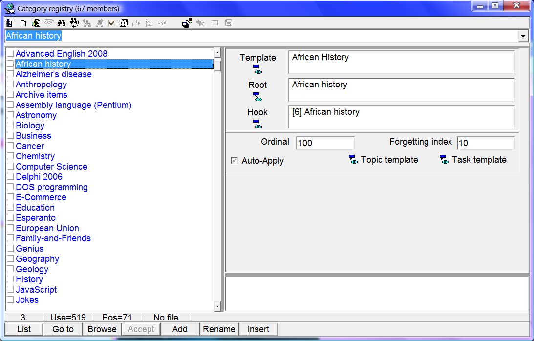 Category registry makes it easy to keep a large number of knowledge categories. These can be used to keep different subjects separate and to give all elements in a category a given look and priority: