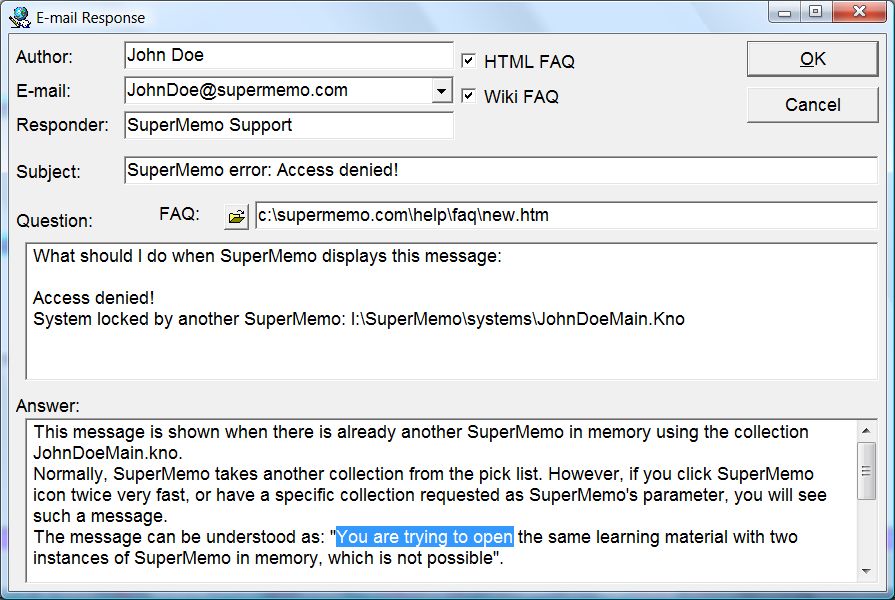 When using incremental reading to process e-mail, you can use the selected text as a question in an FAQ. The FAQ will be sent as a reply, and stored in FAQ files (as HTML and/or Wiki):