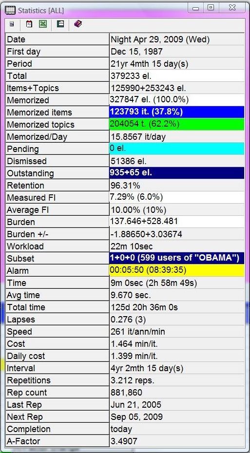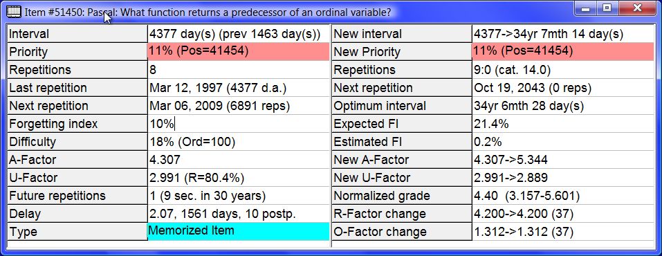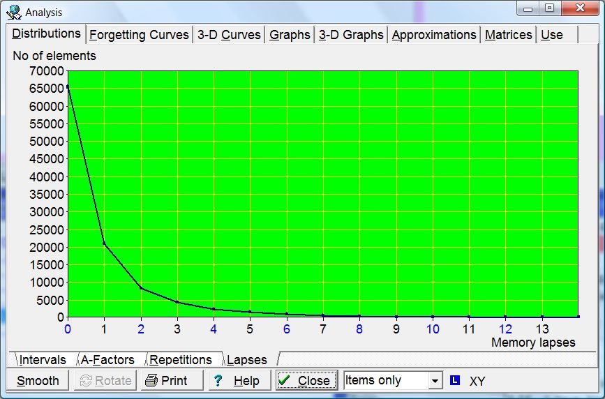 In SuperMemo, you decide how much of you material you want to remember (95% by default). Even though this means that you will forget some 10% of your items at repetition time, a vast majority will still never be forgotten within your lifespan (see an example statistic of forgotten elements below). With SuperMemo, your investment in learning is safe: