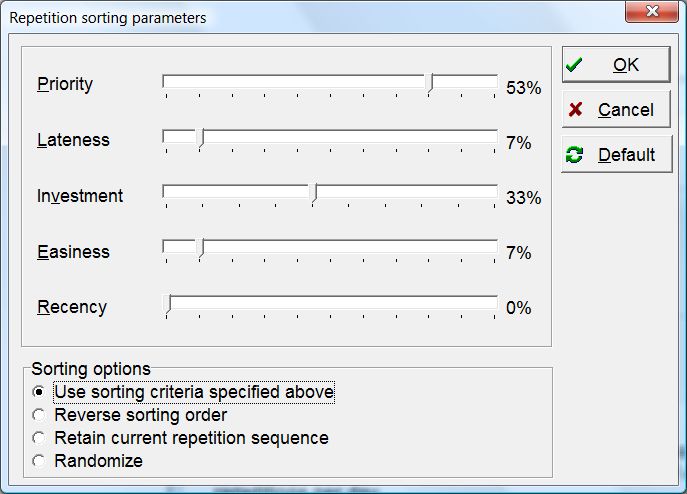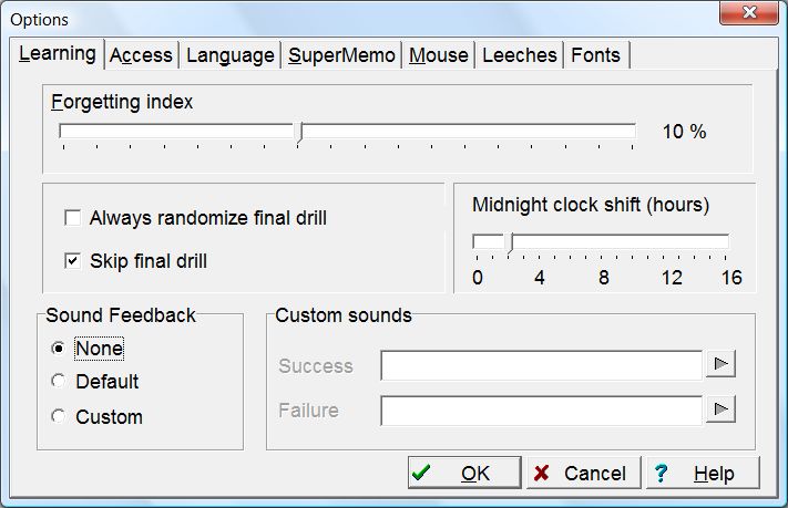 Learning options make it possible to define the speed of learning, time when your 'memory day' ends (i.e. time you go to sleep), etc.