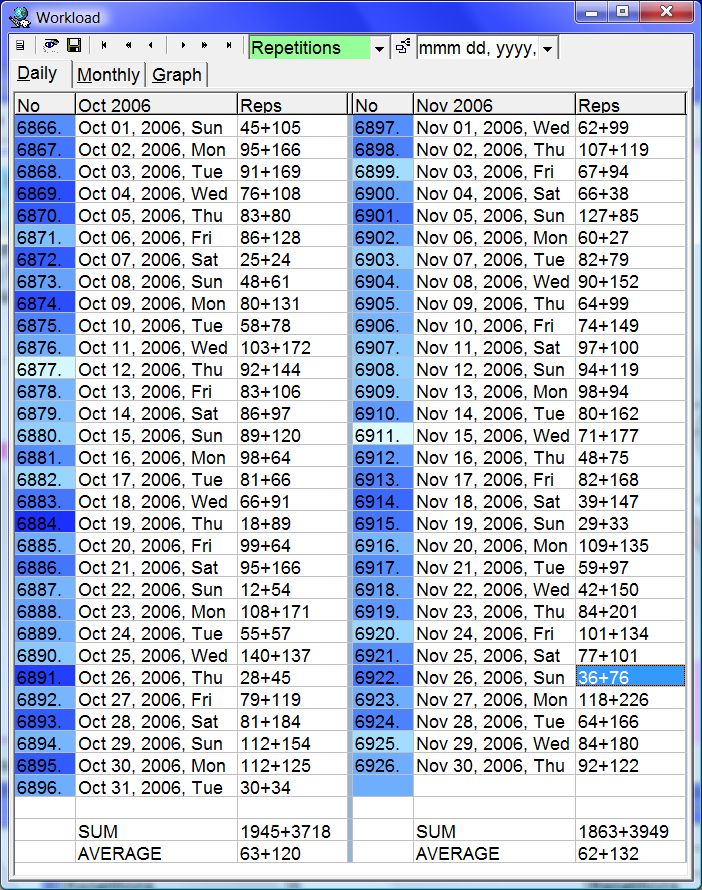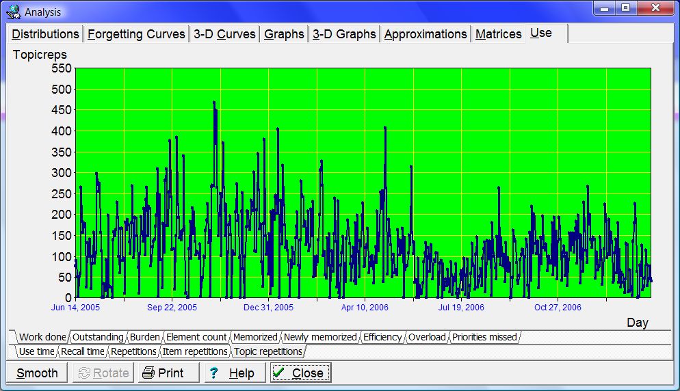 SuperMemo clearly demonstrates your processing capacity for high priority material on individual days. For example, the picture below shows worst misses amongst most important topics to review: