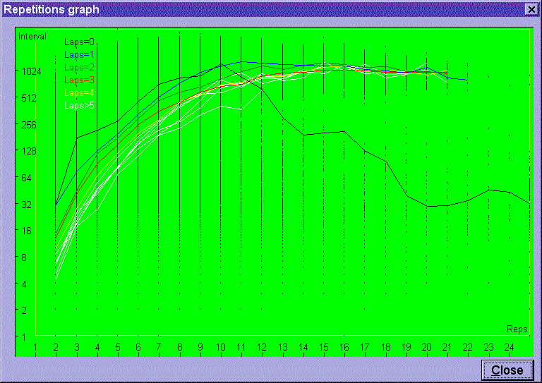 The horizontal axis corresponds with the repetition number and the vertical axis represents intervals (logarithmic scale). Despite popular belief, the semi-log scale does not produce a linear graph here. Clearly the increase in the length of intervals slows down with successive repetitions. Moreover, the graph corresponding with zero lapses (black curve), results from the superposition of items with lower and faster increase in intervals (determined by difficulty). The bell-shaped curve is determined by all contributing items (below repetition number 10) and then only by difficult items or items with low forgetting index for which the increase in the length of intervals is significantly slower (above repetition 10). To see the above graph in your own collection, use Tools : Repetitions graph in the browser