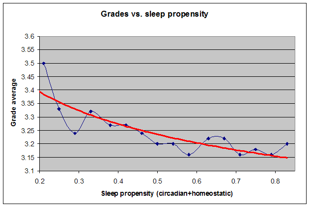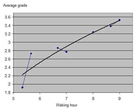 In other data sets, it has also be found that later waking up (after 11 am) often correlates with lower grades again (perhaps as a result of weekend late "partying" that results in poorer sleep and later awakening).