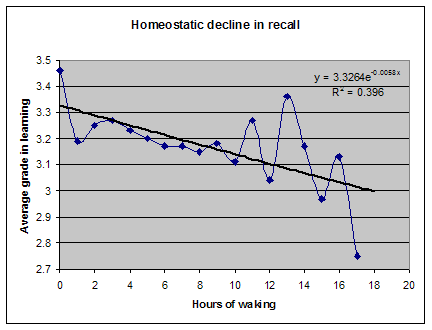 As the day goes on, your ability to store facts in memory declines. The graph has been constructed by correlating the time of learning (in reference to waking time), and the grade scored in the next repetition (often months after the original learning). Again, naps seem to restore the consolidation power to baseline. As much as recall, consolidation seems to be reversely correlated with the homeostatic drive to sleep. A slight increase in the quality of learning can also be seen around the 12th hour of natural waking.
