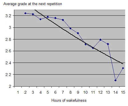As the day goes on, our ability to recall facts from memory is getting worse and worse. Interestingly, even a short nap seems to bring back the recall to the baseline level. In other words, there seems to be a direct link between recall and alertness. Recall seems to be reversely correlated with the homeostatic drive to sleep. A slight increase in recall around the 12th hour of wakefulness is a reflection of the circadian component of alertness. The waviness at later waking hours seen in the graph comes from scarcity of data as learning at later hours makes little sense (of total 31,000 repetitions used to plot the graph, only 684 fell beyond the 10th hour of waking).