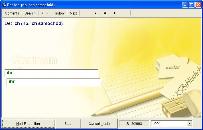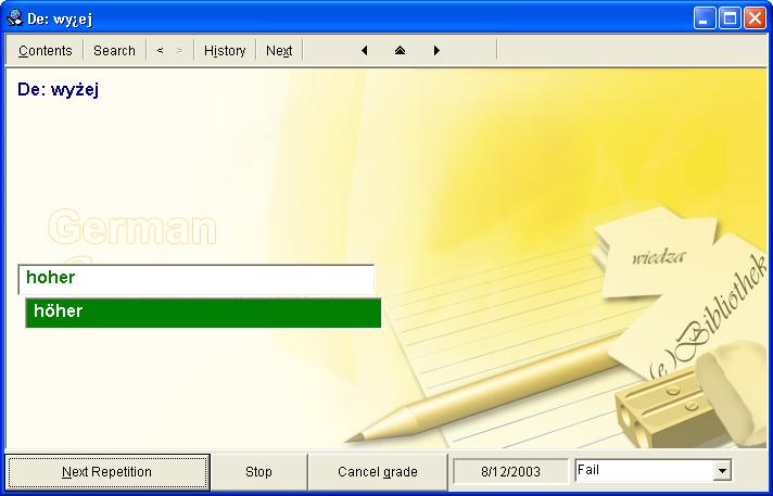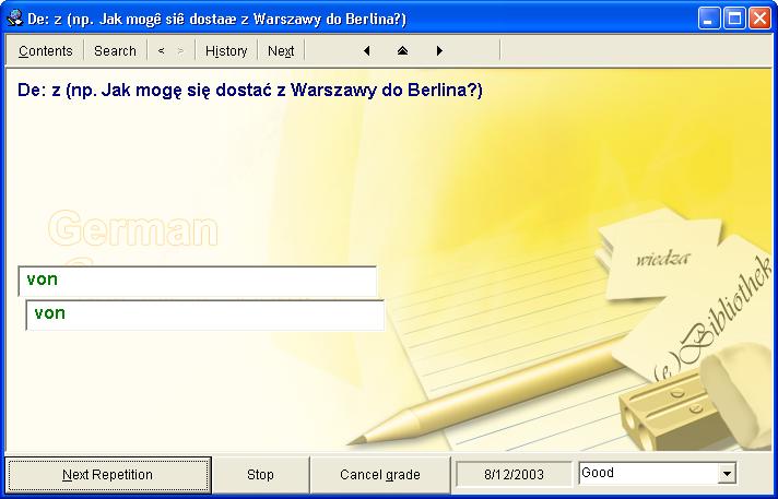 German Speller 2004 Polish Ed. offers all the German words and phrases that beginners need to know. Together with SuperMemo, it probably makes the best and fastest start on the avenue towards excellent German.