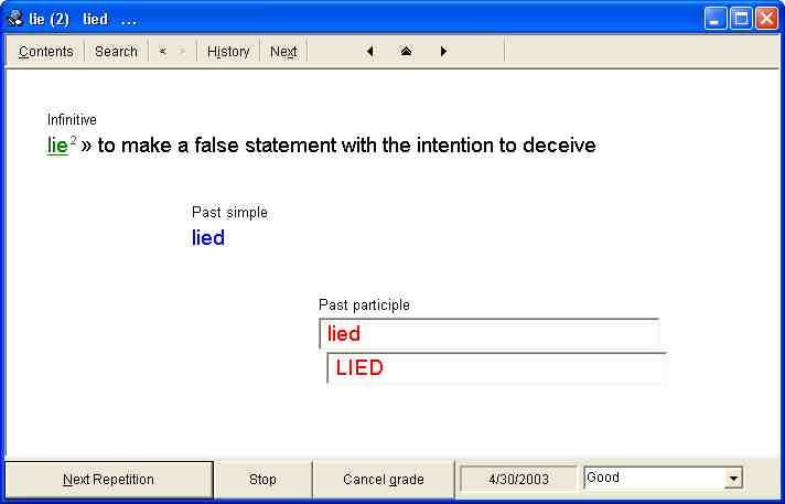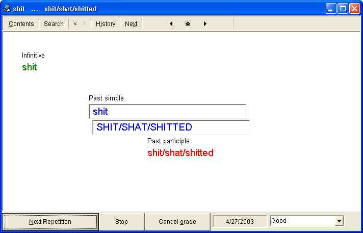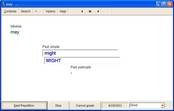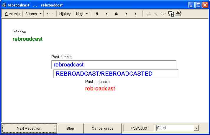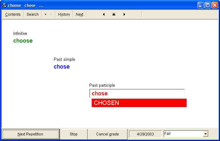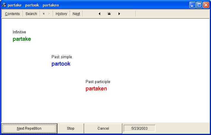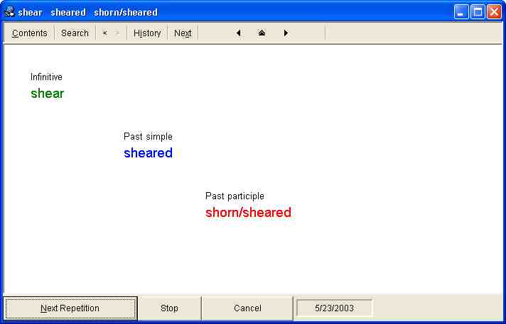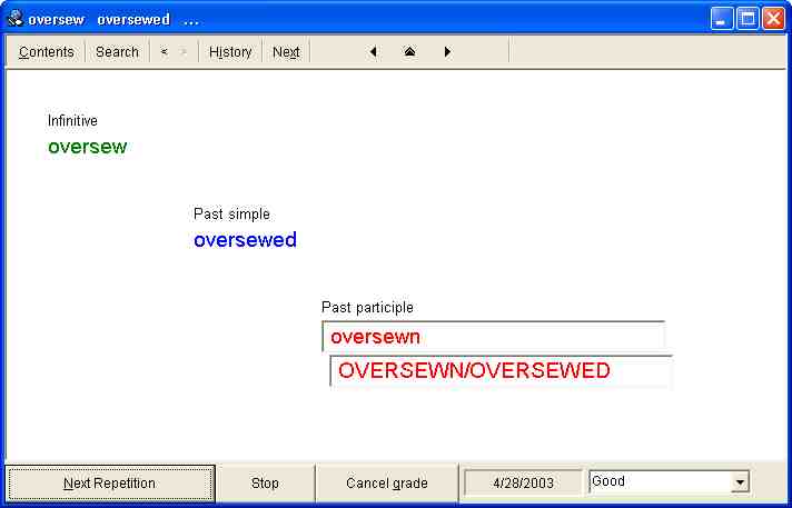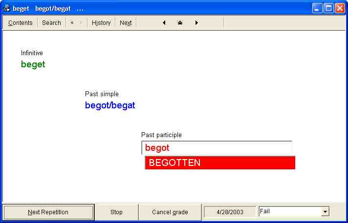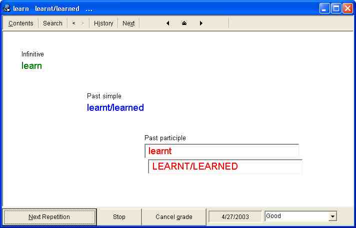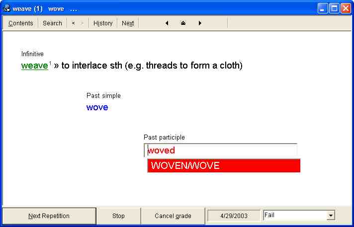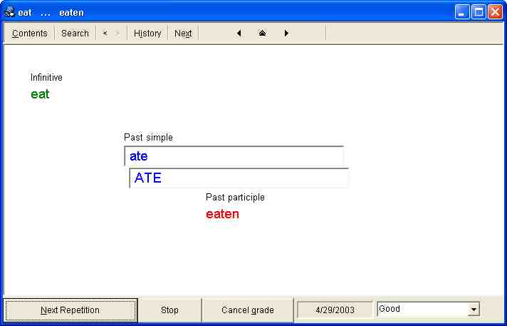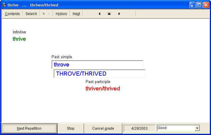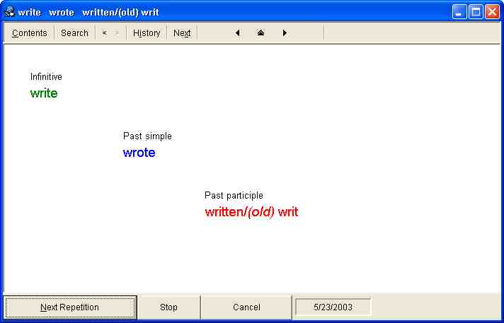 The collection contains additional spelling exercises that will help you drill learned material. Pending queue (i.e. queue of elements that are awaiting memorization) is sorted by the frequency of a given irregular verb.